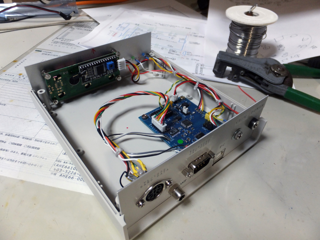 我がシャックは狭い部屋なので、本当はこのインターフェースも出来るだけ小形に組み立てたかったけど、メイン基板の大きさは小形ながら、表示部の大きさからある程度のケースサイズが必要と云う事で、桒原さんのホームページにあったタカチ製のSY-150Aと云うプラスチックケースを筐体に使う事にしました。